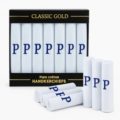Dudu n girlie 7 piece pure cotton initial monogrammed men's handkerchiefs hanky gift box set Size: 16 inches x 16 inches/ 40 cm x 40 cm 100% pure cotton, excellent quality Care guide: machine washable, tumble dry