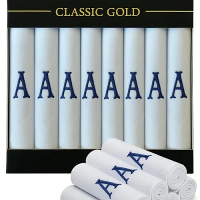 Dudu N Girlie 7 piece pure cotton initial monogrammed men's handkerchiefs Hanky gift box Set Size: 16 inches x 16 inches/ 40 cm x 40 cm 100% pure cotton, excellent quality Care guide: machine washable, tumble dry