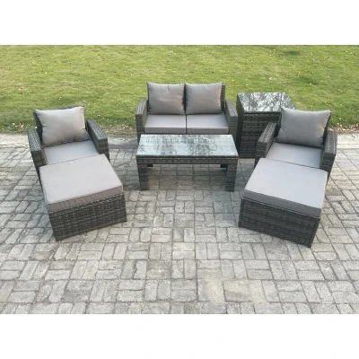 >>This Modern deluxe rattan garden furniture is best for multiple occasion. The Rattan set is strong durability which lasts for a long time, it also has strong tampered table top glass. Cushions are included and are fitted to the shape of the sofa and chairs for comfort. This wonderful product will help you showcase any garden, patio or conservatory. >>Set Dimensions: • 1 x Side coffee table size:65L x 65W x 66H cm • 2 x Big footstool: 65L x 65W x 34H CM • 2 x Arm chairs size: 72L x 70W x 74H CM • 1 x 2 Seater sofas size: 124L x 70W x 74H CM • 1 x Coffee Table Size: 105L x 50W x 48H cm >> Dark grey mixed rattan with dark grey fabric .Color may vary due to light or monitor .we are unable to return the item due to this problem .Please consult us before purchase if you have requirements on color saturation >> Items Comes flat pack ,self assembled is necessary .Sturdy Galvanized Steel Tube Metal Frames With Powder Coating To Prevent The Rust,Ergonomic High Back And Declining Design For