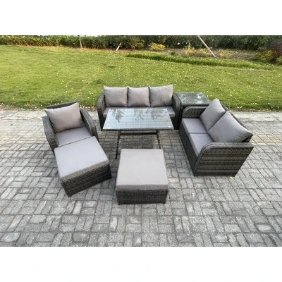 General description This 7-piece deluxe garden furniture set enhances the aesthetic of your courtyard, deck, backyard, porch, or swimming pool. Constructed from high-quality PE rattan and durable galvanized steel, it is designed to withstand adverse weather conditions and can be easily reconfigured to suit your needs. Technical specifications 1 x Side coffee table: 65L x 65W x 66H cm 2 x Big footstools: 65L x 65W x 34H cm 1 x Reclining chair: 74W x 67D x 79H cm 1 x Love sofa: 124W x 67D x 79H cm 1 x 3-seater sofa: 177W x 67D x 79H cm 1 x Rectangular dining table: 110L x 70W x 70H cm Color: Dark grey mixed rattan with dark grey fabric Installation Items come flat packed and are easy to assemble. Includes sturdy galvanized steel tube frames with powder coating to prevent rust. Usage Adjustable armchair with a backrest inclination range of 90°-130°. 8 cm thick seat cushions and soft pillow back cushions for added comfort. Removable cushion covers for easy maintenance. Recommended to keep