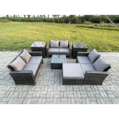 General description This outdoor garden furniture sofa set provides ample seating for up to 7 people, featuring a tempered glass coffee table ideal for holding food, drinks, and more. It is a perfect addition to your patio, garden, backyard, pool, and other indoor and outdoor spaces. Technical specifications Set includes: 2 side coffee tables, 1 square coffee table, 1 big footstool, and 3 two-seater sofas 2 x Side coffee table size: 65L x 65W x 66H cm 1 x Square coffee table size: 65L x 65W x 34H cm 1 x Big footstool size: 65L x 65W x 34H cm 3 x 2 Seater sofas size: 124L x 70W x 74H cm Material: Dark grey mixed rattan with dark grey fabric Seat cushion thickness: 8 cm Installation Items come flat packed and are easy to assemble Usage Keep the cushion indoors or use a rain cover when not in use Use a rain cover to protect the furniture if not used for a long time Other information Sturdy galvanized steel tube metal frames with powder coating to prevent rust 5mm thickness transparent