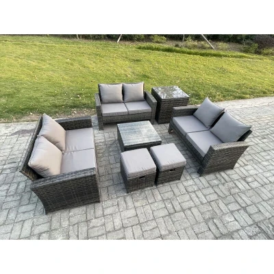 General description This outdoor garden furniture sofa set provides ample seating for up to 8 people, featuring a tempered glass coffee table ideal for holding food, drinks, and more. It is a perfect addition to your patio, garden, backyard, pool, and other indoor and outdoor spaces. Technical specifications Side coffee table size: 65L x 65W x 66H cm Square coffee table size: 65L x 65W x 34H cm Small footstool size (2 units): 40L x 40W x 37H cm 2-seater sofa size (3 units): 124L x 70W x 74H cm Material: Dark grey mixed rattan with dark grey fabric Seat cushion thickness: 8 cm Glass thickness: 5 mm tempered glass Installation Items come flat packed and are easy to assemble. The furniture features sturdy galvanized steel tube metal frames with powder coating to prevent rust. Usage This furniture set is designed for low maintenance. The cushion covers are removable for easy cleaning. It is recommended to keep the cushions indoors or use a rain cover when not in use. For long-term