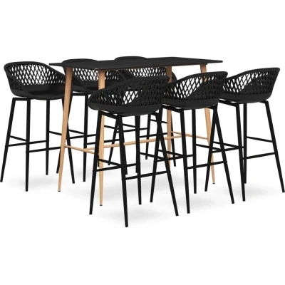 General description Featuring a modern and contemporary design, this 7 Piece Bar Set is perfect for any modern home, garden, bar, pub, or restaurant. Its clean design complements any interior decor, making it a versatile addition to your space. Technical specifications Bar table: Colour: Black Material: MDF, metal Dimensions: 120 x 60 x 105 cm (L x W x H) Legs with heat transfer print in wood look Bar stools: Colour: Black Material: PP, metal Dimensions: 48 x 47.5 x 95.5 cm (W x D x H) Seat height from the ground: 74.5 cm Low back seat with mesh look Maximum weight capacity: 110 kg per seat Assembly required: Yes Delivery contains 1 x Bar table 6 x Bar stools Other information