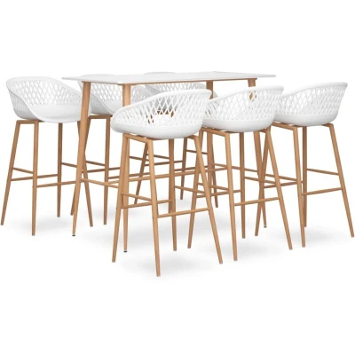 General description Featuring a modern and contemporary design, this 7 Piece Bar Set is perfect for any modern home, garden, bar, pub, or restaurant. Its clean lines and stylish appearance will complement any interior decor. Technical specifications Bar table: Colour: White Material: MDF, metal Dimensions: 120 x 60 x 105 cm (L x W x H) Legs with heat transfer print in wood look Bar stools: Colour: White Material: PP, metal Dimensions: 48 x 47.5 x 95.5 cm (W x D x H) Seat height from the ground: 74.5 cm Low back seat with mesh look Legs with heat transfer print in wood look Maximum weight capacity: 110 kg per seat Assembly required: Yes Delivery contains: 1 x Bar table 6 x Bar stools Other information