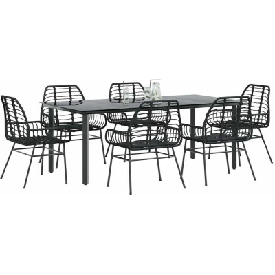 ManoManoGeneral description This 7 Piece Garden Dining Set is perfect for al fresco dining or simply relaxing in your garden, backyard, or patio. Made from durable materials, it combines style and functionality for your outdoor space. Technical specifications Material: PE rattan (poly rattan), powder-coated steel, tempered glass Maximum weight capacity (per seat): 110 kg Garden table dimensions: 200 x 100 x 74 cm (L x W x H) Garden chair dimensions (each): 57 x 60 x 86 cm (W x D x H) Seat size: 43 x 48 cm (W x D) Seat height from the ground: 44 cm Armrest height from the ground: 58 cm Colour: Black Assembly required: Yes Compatibility and accessories Cushion included: No Installation Assembly required: Yes Usage Recommended to protect with a waterproof cover to maintain appearance Other information