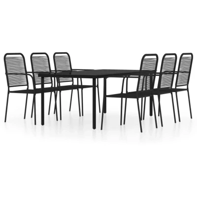 ManoManoGeneral description This trendy 7 Piece Garden Dining Set features an elegant design and clean lines, making it an excellent choice for your garden, patio, terrace, kitchen, or dining room. The simplistic elegance of this dining set enhances your everyday dining experience. Technical specifications Table: Colour: Black Material: Powder-coated steel, glass Dimensions: 200 x 100 x 74 cm (L x W x H) Glass thickness: 5 mm Chair: Colour: Black Material: Cotton rope, steel Dimensions: 56 x 53.5 x 85.5 cm (W x D x H) Seat width: 46 cm Seat depth: 42 cm Seat height from the ground: 43 cm Armrest height from the ground: 63.5 cm Assembly required: Yes Delivery contains: 1 x Table 6 x Chairs Usage To extend the life of your outdoor furniture, it is recommended to clean it regularly and avoid leaving it outdoors without protection unnecessarily. Use a mild soap solution for cleaning. If possible, store the set in a cool, dry place indoors. If stored outdoors, protect it with a waterproof cover.
