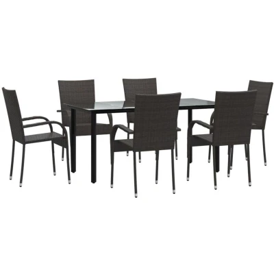ManoManoGeneral description This 7 Piece Garden Dining Set is an excellent choice for dining or relaxing in your outdoor space. Made from durable materials, it combines quality, convenience, and aesthetic appeal, ensuring it remains beautiful for a long time. Technical specifications Table: Colour: Black Material: Powder-coated steel, tempered glass Dimensions: 160 x 80 x 74 cm (L x W x H) Chair: Colour: Brown Material: PE rattan, powder-coated steel Dimensions: 55.5 x 53.5 x 95 cm (W x D x H) Seat width: 34 cm Seat depth: 43 cm Seat height from the ground: 44 cm Armrest height from the ground: 64 cm Maximum weight capacity: 110 kg per seat Compatibility and accessories Delivery contains: 1 x Table 6 x Chairs Installation Each product comes with an assembly manual in the box for easy assembly. Usage To extend the life of your outdoor furniture, it is recommended to protect it with a waterproof cover. Other information