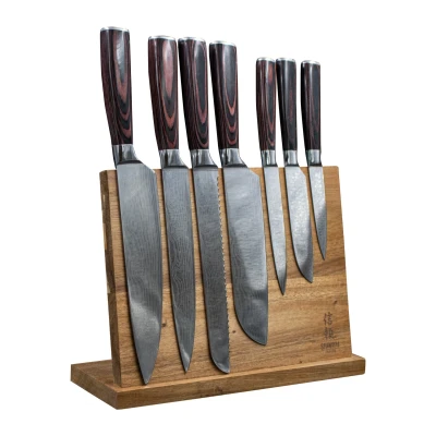 7 piece Japanese knife set damascus print + acacia wooden holder