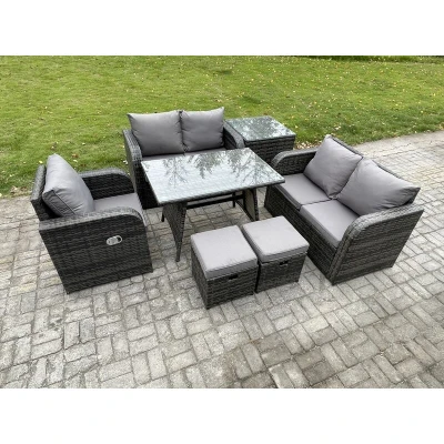 General description This modern deluxe rattan garden furniture set is perfect for various occasions, enhancing any garden, patio, or conservatory. The set includes a dining table, armchairs, a love sofa, a side table, and two small footstools, all designed for durability and comfort. Technical specifications Set Dimensions: Side coffee table: 65L x 65W x 66H cm Small footstools (2): 40L x 40W x 34H cm Reclining chair: 74W x 67D x 79H cm Love sofa (2): 124W x 67D x 79H cm Rectangular dining table: 110L x 70W x 70H cm Material: Dark grey mixed rattan with dark grey fabric Seat cushion thickness: 8 cm Glass top: 5 mm thickness tempered glass Installation Items come flat packed and are easy to assemble. Sturdy galvanized steel tube metal frames with powder coating to prevent rust. Usage Cushions are included and fitted to the shape of the sofa and chairs for added comfort. The armchairs are adjustable, allowing you to change the backrest inclination from 90° to 130°. For maintenance, keep