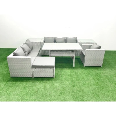 General description This deluxe rattan sofa set is a great addition to your patio or garden. It is made of high-quality PE rattan and features a durable galvanized steel construction, ensuring sturdiness and longevity. This furniture set can be left outdoors all year round. Technical specifications Set Dimensions: 2 x Sofa with double armrest: 177W x 65D x 66H cm 1 x Armchair: 74L x 65W x 66H cm 2 x Side coffee tables: 65L x 65W x 66H cm 1 x Big footstool: 65L x 65W x 34H cm 1 x Rectangular Dining Table: 140L x 80W x 69H cm Color: Light grey mixed rattan with dark grey fabric Installation Items come flat packed and are easy to assemble. Includes sturdy galvanized steel tube metal frames with powder coating to prevent rust. Usage Low maintenance required. Removable cushion covers for easy cleaning. Recommended to keep cushions indoors or use a rain cover when not in use. Use a rain cover if the furniture is not used for a long time. Other information 8 cm thick seat cushions with soft