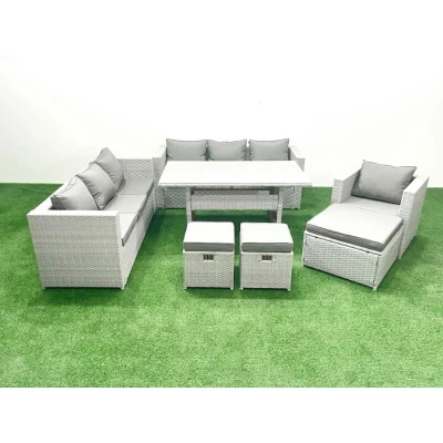 This deluxe rattan sofa set is a great addition to patio or garden, made of high quality PE rattan and durable galvanized steel construction for sturdiness and long lasting.Durability ,and can be put outdoor all year round. • Set Dimensions: • 2 x Sofa with double armrest: 177W x 65D x 66H cm • 1 x Arm chairs size: 74L x 65W x 66H CM • 1 x Big footstool :65L x 65W x 34H cm • 2 x Fully Assembled Stools :40W x 40D x 34H cm • 1 x Rectangular Dining Table :140L x 80W x 69H cm • Light grey mixed rattan with dark grey fabric .Color may some difference due to light or monitor .we are unable to return the item due to color problem . • Items Comes Flat Packed And Easy Assemble,Sturdy Galvanized Steel Tube Metal Frames With Powder Coating To Prevent The Rust • Flat PE Rattan Completely Made By Hand, 5mm Thickness transparent Tempered Glass With Sucker On Surface To Prevent Sliding • Low Maintenance ,Removable Cushion Cover And Easy Move To Different Place.Pls Keep the Cushion Indoor Or put on