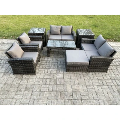7 Seater Dark Grey Mixed High Back Rattan Sofa Set Coffee Table Garden Furniture Outdoor Patio With Love Arm Chairs 2 Side Tables Big Footstool