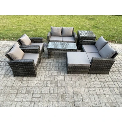 7 Seater Dark Grey Mixed High Back Rattan Sofa Set Coffee Table Garden Furniture Outdoor Patio With Love Arm Chairs Big footstool Side