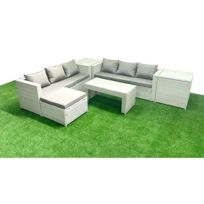 7 Seater Garden Outdoor Rattan Furniture Set Sofa Oblong Coffee Table with Big Footstool 2 Side Tables Light Grey Mixed Fimous