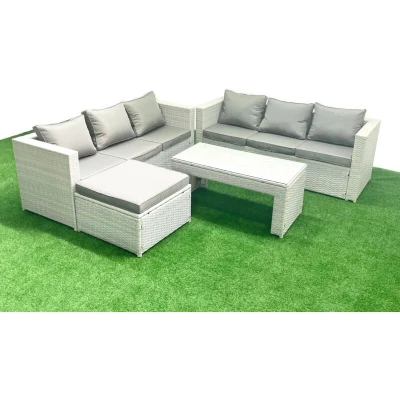 7 Seater Garden Outdoor Rattan Furniture Set Sofa Oblong Coffee Table with Big Footstool Light Grey Mixed Fimous