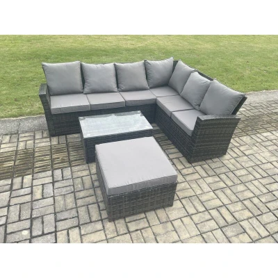 7 Seater High Back Outdoor Garden Furniture Set Rattan Corner Sofa With Rectangular Coffee Table Big Footstool Dark Grey Mixed Fimous