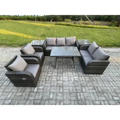 General description This outdoor rattan lounge sofa set is a perfect addition to your patio or garden, crafted from high-quality PE rattan and durable galvanized steel for sturdiness and longevity. It is designed for outdoor use all year round, making it an ideal setting for gatherings with family and friends. Technical specifications Set Dimensions: 2 x Side Coffee Table: 65L x 65W x 66H cm 2 x Reclining Chair: 74W x 67D x 79H cm 1 x Love Sofa: 124W x 67D x 79H cm 1 x 3 Seater Sofa: 177W x 67D x 79H cm 1 x Rectangular Dining Table: 110L x 70W x 70H cm Color: Dark grey mixed rattan with dark grey fabric Seat Cushion Thickness: 8 cm Installation Items come flat packed and are easy to assemble. Includes sturdy galvanized steel tube metal frames with powder coating to prevent rust. Usage The armchairs are adjustable, allowing you to change the backrest inclination from 90° to 130° using a button. Removable cushion covers for easy maintenance. It is recommended to keep the cushions
