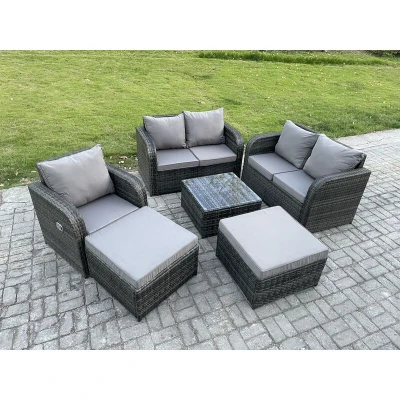 General description This 7-seater deluxe garden furniture set enhances the aesthetic of your courtyard, deck, backyard, porch, or swimming pool. Constructed from high-quality PE rattan and durable galvanized steel, it is designed to withstand adverse weather conditions in the UK. The set can be easily reconfigured to suit your needs at any time. Technical specifications Set includes: 2 x Big footstool: 65L x 65W x 34H cm 1 x Reclining Chair: 74L x 67W x 79H cm 2 x Love Sofa: 124W x 67D x 79H cm 1 x Square Coffee Table: 65L x 65W x 34H cm Seat cushion thickness: 8 cm Material: Dark grey mixed rattan with dark grey fabric Installation Items come flat packed and are easy to assemble. Includes sturdy galvanized steel tube metal frames with powder coating to prevent rust. Usage Adjustable armchair with a backrest inclination range of 90°-130°. Removable cushion covers for easy maintenance. Recommended to keep cushions indoors or use a rain cover when not in use. Use a rain cover if the