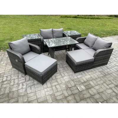General description This modern deluxe rattan garden furniture set is perfect for various occasions, enhancing any garden, patio, or conservatory. It includes a dining table, armchairs, a love sofa, two big footstools, and two side tables, all designed for comfort and durability. Technical specifications Set Dimensions: 2 x Side coffee table: 65L x 65W x 66H cm 2 x Big footstool: 65L x 65W x 34H cm 1 x Reclining Chair: 74W x 67D x 79H cm 2 x Love Sofa: 124W x 67D x 79H cm 1 x Rectangular Dining Table: 110L x 70W x 70H cm Material: Dark grey mixed rattan with dark grey fabric Seat Cushion Thickness: 8 cm Glass Thickness: 5 mm tempered glass Installation Items come flat packed and are easy to assemble. Includes sturdy galvanized steel tube metal frames with powder coating to prevent rust. Usage Cushions are included and fitted to the shape of the sofa and chairs for added comfort. The armchairs are adjustable, allowing you to change the backrest inclination from 90° to 130°. For