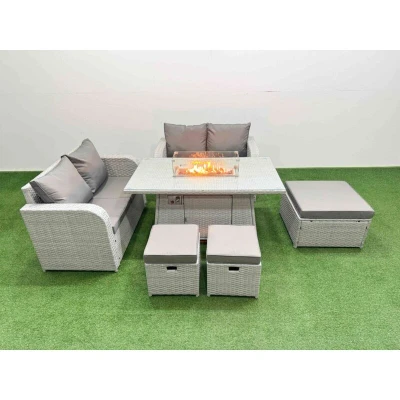 7 Seater Outdoor Love Sofa Set Rattan Garden Furniture with Firepit Dining Table 3 Footstool Light Grey Fimous