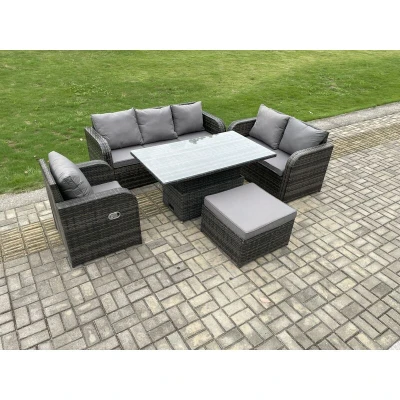General description This deluxe reclining rattan sofa set is a great addition to your patio or garden. Made of high-quality PE rattan and durable galvanized steel construction, it offers sturdiness and long-lasting durability, making it suitable for outdoor use all year round. This set is perfect for gathering with family and friends. Technical specifications 1 x Big Footstool: 65L x 65W x 34H cm 1 x Reclining Chair: 74L x 67W x 79H cm 1 x Love Sofa: 124W x 69D x 79H cm 1 x 3 Seater Sofa: 177W x 67D x 79H cm 1 x Lifting Rising Table: 140L x 80W x 68/48H cm (height adjustable from 68 cm to 48 cm) Color: Dark grey mixed rattan with dark grey fabric Seat Cushion Thickness: 8 cm Armrest Width: 9 cm Glass Table Surface: 5 mm thickness clear tempered glass Installation Items come flat packed and are easy to assemble. Sturdy galvanized steel tube metal frames with powder coating to prevent rust. Usage The reclining chairs are adjustable, allowing you to change the backrest inclination from