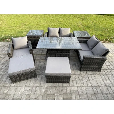 7 Seater Outdoor Rattan Patio Furniture Set Garden Height Adjustable Rising Lifting Table Sofa Dining with 2 Side Tables Big Footstool Dark