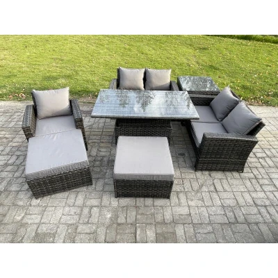7 Seater Outdoor Rattan Patio Furniture Set Garden Height Adjustable Rising Lifting Table Sofa Dining with Side 2 Big Footstool Dark