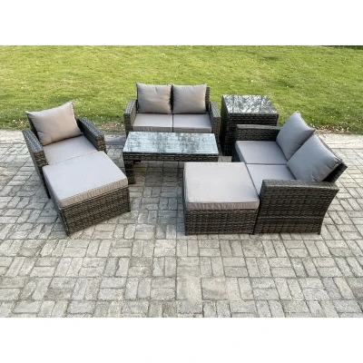 7 Seater Outdoor Rattan Patio Furniture Set Garden Lounge Sofa with Side Table 2 Big Footstool Coffee Dark Grey Mixed Fimous
