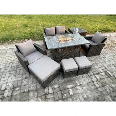 7 Seater Outdoor Rattan Sofa Set Garden Furniture Gas Firepit Dining Table Heater with 3 Footstools Side Dark Grey Mixed Fimous