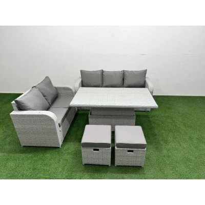 General description This deluxe Garden furniture set enhances your courtyard, deck, backyard, porch, or swimming pool area. It is constructed from high-quality PE rattan and durable galvanized steel, designed to withstand adverse weather conditions. The set can be easily configured into different arrangements to suit your needs. Technical specifications 1 x Love Sofa Size: 124W x 67D x 79H cm 1 x 3 Seater Sofa Size: 177W x 67D x 79H cm 2 x Fully Assembled Stools: 40W x 40D x 34H cm 1 x Lifting Table Size: 140L x 80W x 68/48H cm (height adjustable: up to 68 cm, down to 48 cm) Seat Cushion Thickness: 8 cm Installation Items come flat packed and are easy to assemble. Sturdy galvanized steel tube frames with powder coating to prevent rust. Usage Keep the cushion indoors or use a rain cover when not in use. Use a rain cover to protect the furniture if not used for an extended period. Other information Light grey PE rattan with dark grey fabric; color may vary due to lighting or monitor