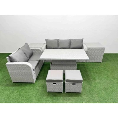 General description This deluxe garden furniture set enhances the aesthetic of your courtyard, deck, backyard, porch, or swimming pool. Constructed from high-quality PE rattan and durable galvanized steel, it is designed to withstand adverse weather conditions in the UK. The set can be easily reconfigured to suit your needs at any time. Technical specifications Love Sofa Size: 124W x 67D x 79H cm 3-Seater Sofa Size: 177W x 67D x 79H cm Side Table Size: 65L x 65W x 66H cm (2 tables) Stool Size: 40W x 40D x 34H cm (2 stools) Lifting Table Size: 140L x 80W x 68/48H cm (height adjustable between 68 cm and 48 cm) Seat Cushion Thickness: 8 cm Installation Items come flat packed and are easy to assemble. Sturdy galvanized steel tube metal frames with powder coating to prevent rust. Usage Low maintenance required. Removable cushion covers for easy cleaning. Keep cushions indoors or use a rain cover when not in use. Use a rain cover if the furniture is not in use for an extended period. Other
