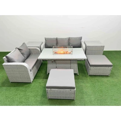 General description This Fimous 7 Seater PE Rattan Wicker Garden Furniture Set is perfect for your patio or conservatory. It includes a 3-seater sofa, a love sofa, two big footstools, and two side tables, all designed for comfort and style. The set features a firepit dining table, making it ideal for outdoor gatherings. The light grey PE rattan is complemented by dark grey fabric cushions, providing a modern aesthetic. Technical specifications 1 x Love Sofa Size: 124W x 67D x 79H cm 1 x 3 Seater Sofa Size: 177W x 67D x 79H cm 2 x Side Table Size: 65L x 65W x 66H cm 2 x Big Footstool Size: 65L x 65W x 34H cm 1 x Firepit Dining Table Size: 140L x 80W x 69H cm Material: Light grey PE rattan with dark grey fabric cushions Thickness of tempered glass: 5mm Seat cushion thickness: 8 cm Installation Items come flat packed and are easy to assemble. Sturdy galvanized steel tube metal frames with powder coating to prevent rust. Usage It is recommended to place the gas fire pit on the glass top,