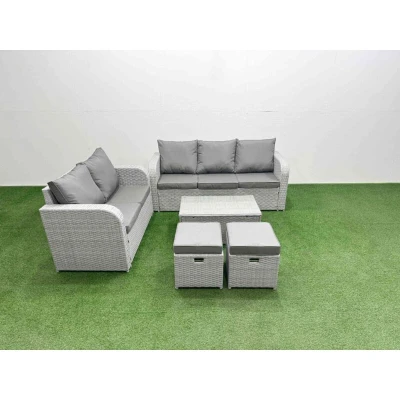 General description This deluxe garden furniture set enhances the aesthetic of your courtyard, deck, backyard, porch, or swimming pool. Constructed from high-quality PE rattan and durable galvanized steel, it is designed to withstand adverse weather conditions in the UK. The set can be easily configured into different arrangements to suit your needs. Technical specifications 1 x Love Sofa Size: 124W x 67D x 79H cm 1 x 3 Seater Sofa Size: 177W x 67D x 79H cm 2 x Fully Assembled Stools: 40W x 40D x 34H cm 1 x Oblong Coffee Table: 85L x 50W x 37H cm Seat Cushion Thickness: 8 cm Material: Light grey PE rattan with dark grey fabric Glass Tabletop: 5mm thickness transparent tempered glass Installation Items come flat packed and are easy to assemble. Sturdy galvanized steel tube metal frames with powder coating to prevent rust. Usage Low maintenance required. Removable cushion covers for easy cleaning. Keep cushions indoors or use a rain cover when not in use. Use a rain cover to protect the