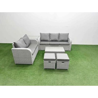 General description This deluxe garden furniture set enhances the aesthetic of your courtyard, deck, backyard, porch, or swimming pool. Constructed from high-quality PE rattan and durable galvanized steel, it is designed to withstand adverse weather conditions in the UK. The set can be easily configured into different arrangements to suit your needs. Technical specifications 1 x Love Sofa Size: 124W x 67D x 79H cm 1 x 3 Seater Sofa Size: 177W x 67D x 79H cm 1 x Side Table Size: 65L x 65W x 66H cm 2 x Fully Assembled Stools Size: 40W x 40D x 34H cm 1 x Oblong Coffee Table Size: 85L x 50W x 37H cm Seat Cushion Thickness: 8 cm Material: Light grey PE rattan with dark grey fabric Glass Thickness: 5 mm tempered glass Installation Items come flat packed and are easy to assemble. Sturdy galvanized steel tube metal frames with powder coating to prevent rust. Usage Low maintenance required. Removable cushion covers for easy cleaning. Keep cushions indoors or use a rain cover when not in use.