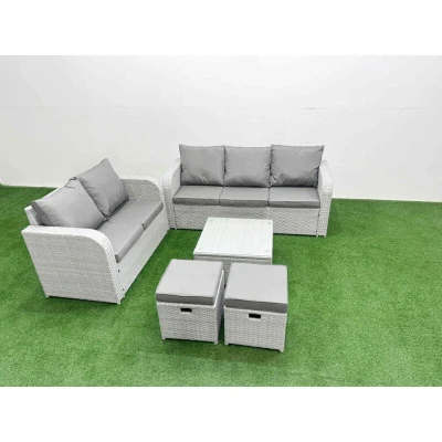 General description This deluxe garden furniture set enhances the decor of your courtyard, deck, backyard, porch, or swimming pool. It is constructed from high-quality PE rattan and durable galvanized steel, designed to withstand adverse weather conditions. The set can be easily reconfigured to suit your needs at any time. Technical specifications 1 x Love Sofa Size: 124W x 67D x 79H cm 1 x 3 Seater Sofa Size: 177W x 67D x 79H cm 2 x Fully Assembled Stools: 40W x 40D x 34H cm 1 x Square Coffee Table: 65L x 65W x 34H cm Seat Cushion Thickness: 8 cm Material: Light grey PE rattan with dark grey fabric Glass Tabletop: 5mm thickness transparent tempered glass Installation Items come flat packed and are easy to assemble. Sturdy galvanized steel tube metal frames with powder coating to prevent rust. Usage Low maintenance required. Removable cushion covers for easy cleaning. Keep cushions indoors or use a rain cover when not in use. Use a rain cover for the furniture if not in use for an