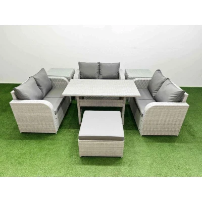 General description This deluxe garden furniture set enhances the aesthetic of your courtyard, deck, backyard, porch, or swimming pool. Constructed from high-quality PE rattan and durable galvanized steel, it is designed to withstand adverse weather conditions in the UK. The set can be easily reconfigured to suit your needs at any time. Technical specifications 3 x Love Sofa Size: 124W x 67D x 79H cm 2 x Side Table Size: 65L x 65W x 66H cm 1 x Big Footstool Size: 65L x 65W x 34H cm 1 x Dining Table Size: 140L x 80W x 68H cm Material: Light grey PE rattan with dark grey fabric Seat Cushion Thickness: 8 cm Glass Thickness: 5 mm tempered glass Installation Items come flat packed for easy assembly. Sturdy galvanized steel tube frames with powder coating to prevent rust. Usage Low maintenance with removable cushion covers. Keep cushions indoors or use a rain cover when not in use. Use a rain cover if the furniture is not in use for an extended period. Other information Factory direct sale
