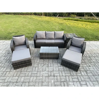 General description This outdoor garden furniture sofa set provides ample seating for up to 7 people. It includes a tempered glass coffee table, making it an ideal addition to your patio, garden, backyard, pool, and other indoor and outdoor spaces. Technical specifications Set Dimensions: 1 x Side coffee table: 65L x 65W x 66H cm 2 x Big footstool: 65L x 65W x 34H cm 2 x Reclining Chairs: 74L x 67W x 79H cm 1 x 3 seater Sofa: 177W x 67D x 79H cm 1 x Oblong Coffee Table: 85L x 50W x 37H cm Material: Dark grey mixed rattan with dark grey fabric Seat Cushion Thickness: 8 cm Installation Items come flat packed and are easy to assemble. Includes sturdy galvanized steel tube metal frames with powder coating to prevent rust. Usage The armchairs are adjustable, allowing you to change the backrest inclination from 90° to 130°. Removable cushion covers for easy maintenance. Recommended to keep cushions indoors or use a rain cover when not in use. Use a rain cover for the furniture if not in use