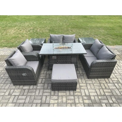 General description This Fimous 7 Seater Rattan Garden Furniture Set includes a propane gas fire pit table, two side tables, a big footstool, two love sofas, and two reclining chairs. The set is designed for outdoor use, providing comfort and style for your garden or patio. The adjustable armchairs allow you to customize your seating position for maximum relaxation. Technical specifications Set dimensions: 2x Side table: 65L x 65W x 66H cm 1x Big Footstool: 65L x 65W x 34H cm 2x Love Sofa: 124W x 67D x 79H cm 2x Reclining Chairs: 74L x 67W x 79H cm 1x Firepit Table: 140L x 80W x 69H cm Material: Dark grey mixed rattan with dark grey fabric Seat cushion thickness: 8 cm Glass top: 5 mm thick transparent tempered glass Installation The furniture set comes flat packed and is easy to assemble. It features sturdy galvanized steel tube metal frames with powder coating to prevent rust. Usage For safety, please place the gas fire pit on the glass top and not underneath it. Ensure the igniter
