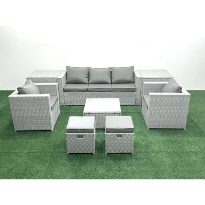 7 Seater Rattan Garden Furniture Set with 3 Sofa 2 Chair Square Coffee Table Small Footstools Side Tables Light Grey Mixed Fimous