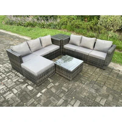 7 Seater Rattan Garden Furniture Sofa Set with Side Table Square Coffee Big Footstool Indoor Outdoor Dark Grey Mixed Fimous