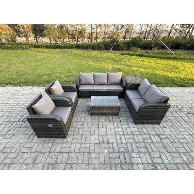 General description This 7-seater outdoor rattan sofa set is an excellent addition to your patio or garden. It is made of high-quality PE rattan and features a durable galvanized steel construction, ensuring sturdiness and longevity. This furniture set is designed for outdoor use all year round, making it perfect for gatherings with family and friends. Technical specifications 1 x Side coffee table: 65L x 65W x 66H cm 2 x Reclining Chairs: 74L x 67W x 79H cm 1 x Love Sofa: 124W x 67D x 79H cm 1 x 3-seater Sofa: 177W x 67D x 79H cm 1 x Oblong Coffee Table: 85L x 50W x 37H cm Color: Dark grey mixed rattan with dark grey fabric Seat cushion thickness: 8 cm Installation Items come flat packed and are easy to assemble. The furniture features sturdy galvanized steel tube frames with powder coating to prevent rust. Usage The armchairs are adjustable, allowing you to change the inclination of the chair back from 90° to 130° using a button. The set includes removable cushion covers for easy
