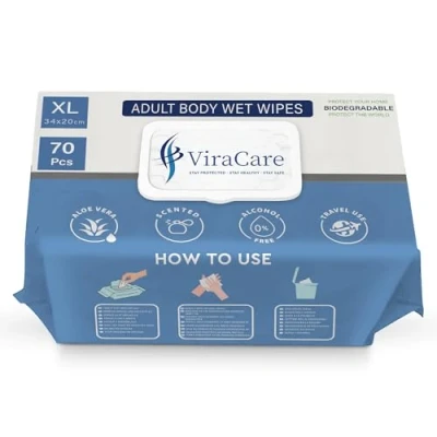 BIODEGRADABLE & ECO-FRIENDLY : ViraCare scented wet wipes are hypoallergenic, alcohol-free and paraben-free which is suitable for most types of skin. Biodegradable wipes are made from natural materials which means they are safer for users. They take less time to decompose and they are easy to recycle, keeping the environment clean and saving the planet we all live in. MULTI-PURPOSE : Body cleansing wet wipes can be used for removing make up, shower substitute, aswell as wiping away sweat, dirt, body odours, grease which keeps your body fresh. ViraCare wet wipes are pre moistened to cleanse, restore and protect skin with just a single use. Incontinence wet wipes can be used for most body parts. GENTLE, SOFT & WITH ALOE VERA SCENTED WET WIPES : ViraCare cleansing intimate wipes are pre-moistened with an aloe based cleansing formula to cleanse, moisturize and soothe skin. These body wipes antibacterial have aunique formula which contains natural Aloe Vera to keep the body fresh and moisturized for longer lasting periods. QUICK FRESHEN-UP CLEANSING WIPES: ViraCare Adult Body wipes are extra large and tear-resistant with a pleasant and quick refreshing fragrance suitable for daily cleansing of the body to help you stay cool, clean, comfortable and refreshed. ViraCare body wipes for adults no shower comes in a portable pack of 70 for convenience and ease of use anytime, anywhere.