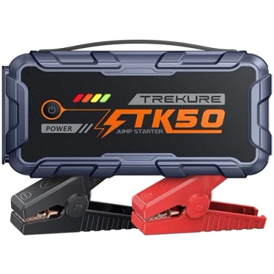 【STRONGER, FASTER, SMALLER】Take control of unexpected car battery situations with an extreme 7000A peak output engineered to restart your vehicles within seconds (Up to ALL Gas/ 12L Diesel). This professional-grade car jump starter delivers reliable battery jump starter performance when it matters most – Built for Real Emergencies. 【Intelligent Safety System with Forced Start】Confidently revive deeply discharged car batteries with forced start function. Built-in 10 safeguards protect against reverse polarity, overheating, overload, and short circuits — combining the strength of a car battery booster jump starter with the safety modern vehicles demand. 【Emergency-Ready 26,800mAh Power for Multiple Starts】This 26800mAh portable jump starter features an 18W USB port for up to 75% faster charging. Widely compatible, it easily charges your phone, tablet, earphones, and drone. Ideal for long journeys, winter conditions, and drivers who value true preparedness. 【Compact Strength with 3-Mode Emergency Lighting】This portable car jump starter pairs strong starting capability with a space-efficient design that fits easily in your glove box or travel bag. Integrated flahshlight, Strobe, and SOS modes enhance visibility during roadside breakdowns, late-night starts, or outdoor situations 【Complete Jump Pack & Extended Warranty】Includes TREKURE jump starter TK50, smart jump leads, usb-c charging cable, storage bag and user guide — everything you need straight out of the box. Backed by an extended 24 months warranty and responsive support for total confidence on every journey.