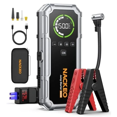 【Jump Start Your Vehicle Easily】With a peak current of up to 7000A, NACKEO star03 jump starter can quickly start all 12V vehicles (up to all gasoline/10L diesel engines) in just three steps in extreme weather conditions ranging from -20°C to 60°C, such as motorcycles, cars, SUVs, RVs, pickup trucks, lawn mowers, etc. @@@OhFIflAqB0dzSwPl/EYrDYO3UxBVFIvA@@@ is the perfect choice for emergencies, long-distance travel, and home backup. 【160PSI Tyre Inflator Air Compressor】The 160PSI jump starter power pack with air compressor features four modes (car, motorcycle, bicycle, and ball), four inflation settings (PSI, BAR, KPA, and kg/cm²), and four nozzles. It can inflate bicycle tires and soccer balls for travel, as well as car tires before a road trip and air mattresses for camping. Covering multiple inflation needs for outdoor activities, road trips, and sports, it offers a "multi-purpose" solution and enhanced travel convenience. 【20000mAh Power Bank+500LM Flashlight】Car jump starter power bank boasts a 20000mAh battery capacity, capable of recharging common devices like phones, tablets, and action cameras multiple times. It can also recharge portable electronics in the event of sudden power outage outdoors, relieving battery anxiety while on the go. It also features a built-in flashlight with three lighting modes (steady, flashing, and SOS), and a high-capacity USB-C power bank. At night, when your car breaks down, a flashlight can illuminate the battery lines, flashes to warn drivers when you're stranded in the wild and activates SOS mode when you're waiting for help after dark 【LED Display+10 Protections+Error Alert】Our battery jump starter features a high-definition display that not only clearly displays the remaining charge and output status in real time, but also provides an intuitive overview of charging progress and fault alerts, allowing you to accurately monitor device status and operate it more safely and conveniently. It also offers ten levels of protection and timely error notifications to prevent overcharging, short circuits, and reverse polarity, ensuring safe starting of your vehicle. 【EVA Suitcase+Package list + Service】The jump pack is equipped with an EVA carrying case, which can not only prevent bumps, squeezing and stains to extend the life of the product, but its hand-held design can also improve portability, save space and be easy to move, and is suitable for multiple scenarios.The package includes 1 x car battery jump starter, 1 x smart clip, 1 x air hose, 4 x air nozzles, 1 x USB-C charging cable (No charger), 1 x EVA carrying case, 1 x instruction manual, and 2 years of hassle-free returns and lifetime technical support. If there is any product or operation problem, please seek our help anytime, we will response within 24 hours.