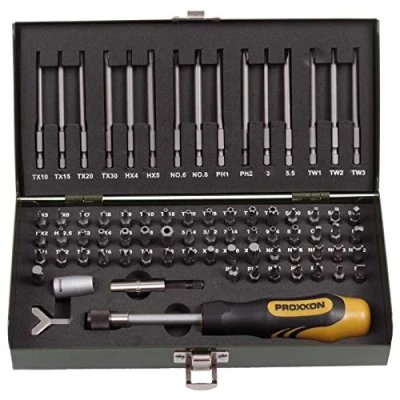 Comes in sturdy steel box Including screwdriver with positive spring-sleeve holder for bits Content: 75 pieces, Weight: 2.866009406 Pounds, Manufacturer: Proxxon
