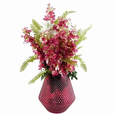 These artificial flower arrangements come with the vases a complete pack of everything you need to create the display shown in our photos. When arranged as we have it shown in our photos this measures 70cm x 50cm x 50cm. Stems are wired and this can be shaped to your requirements This pack contains the following: 1 x LEAF-40581 23cm diamond embossed pink glass vase 23cm tall x 22cm x 22cm at widest points and the slightly narrower top rim measures 13cm diameter. 2 x LEAF-40675 60cm white starflower stem with five silk flowers. 6 x LEAF-40693 75cm delphinium silk dark pink artificial stem. 2 x LEAF-40696 95cm artificial Himalayan maidenhair fern stem. . High quality product by Leaf Design UK. Flowers and foliage are supplied loose at full length ready for you arrange. You can cut these shorter if wanted for arrangement (very easy- just use wire cutters) or you can just fold the stems at the ends before putting them in the vase. . We also supply all these components separately if you want to add to your arrangement.