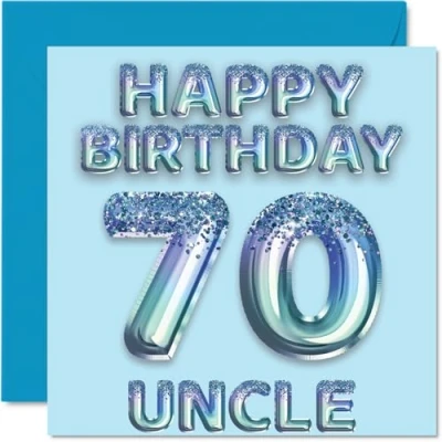 MAKE YOUR UNCLE SMILE WITH THIS AWESOME BIRTHDAY CARD: This exceptional quality birthday card for him shows the design of blue glitter balloons stating 'Happy Birthday 70' Uncle'. If you are looking for funny birthday cards for men, then then this happy birthday card is bound to make them laugh. Not just for friendship gifts for men this could also be for Uncle or Step Uncle. WHAT DO YOU GET: The card is printed on one side and BLANK ON THE INSIDE to allow you to write your very own message. The unique fun design is printed on a specially sourced and environmentally responsible board. At 360 microns thick the natural white one-sided gloss board has a quality look and feel. Supplied with a coloured gummed envelope to complement the design and ready to be sealed and sent in the post. Birthday card for Uncle, 70th birthday card for him. NO INK SMUDGES: There is nothing worse than writing inside a card to find that the shiny surface makes the ink smudge. This is why we use a high quality one sided coated board. The uncoated side will absorb more of the ink from your pen to make smudging a thing of the past. Uncle birthday cards, birthday card cute, 70th birthday gifts for Uncle, Uncle birthday cards. SIZES: Greeting Card = 145mm x 145mm, Envelope = 155mm x 155mm, Card Thickness = 360 micron. Great Uncle birthday cards from Niece and Nephew, male birthday card, 70th birthday card, happy birthday Uncle cards, family birthday card. MADE AND QUALITY CHECKED IN THE UK: We print and manufacture all our product right her in the UK so you can be sure of a fast turnaround and a product that is expertly made. Using environmentally responsible premium board our card is conscious of the responsible management of the world's forests.
