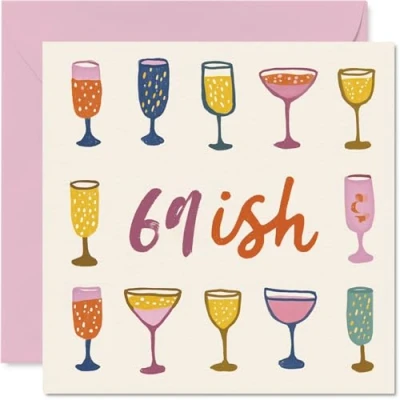 MAKE THEM SMILE WITH THIS UNIQUE BIRTHDAY CARD: This exceptional quality birthday card for him or her shows the design '69 Ish'. If you are looking for special birthday greetings cards for Men birthday card then then this happy birthday card is bound to make them smile. Not just for birthday gifts for Men this could also be for Nan, Dad, Sister, Grandma, Wife, Grandad, Husband or Nanny. WHAT DO YOU GET: The cards are printed on both sides with the inside print saying 'Have a Wonderful Day' and ample space for your own personal message. The unique fun design is printed on a specially sourced and environmentally responsible board. At 360 microns thick the natural white one-sided gloss board has a quality look and feel. Supplied with a coloured gummed envelope to complement the design and ready to be sealed and sent in the post. NO INK SMUDGES: There is nothing worse than writing inside a card to find that the shiny surface makes the ink smudge. This is why we use a high quality one sided coated board. The uncoated side will absorb more of the ink from your pen to make smudging a thing of the past. 70th Birthday card for Sister, 70th Birthday card for Grandma, 70th Birthday card for Wife. SIZES: Greeting Card = 145mm x 145mm, Envelope = 155mm x 155mm, Card Thickness = 360 micron. Grandad 70th birthday card, birthday cards for Husband, special birthday cards for Nanny, 70th birthday card Nan, Dad 70th birthday card. MADE AND QUALITY CHECKED IN THE UK: We print and manufacture all our products right here in the UK so you can be sure of a fast turnaround and a product that is expertly made. Using environmentally responsible premium board our card is conscious of the responsible management of the world's forests - perfect birthday cards for Men, fun birthday cards for him, Dad 70th birthday cards, female birthday cards.