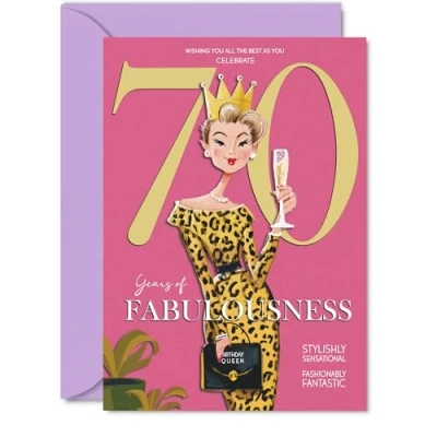 MAKE HER SMILE WITH THIS UNIQUE BIRTHDAY CARD: This exceptional quality birthday card for her shows the design 'Wishing you all the best as you celebrate 70 years of fabulousness'. If you are looking for special birthday greetings cards for Women birthday card then then this happy birthday card is bound to make her smile. Not just for birthday gifts for Women this could also be for Wife, Grandma, Auntie, Nan, Cousin, Granny, Nanny or Sister. WHAT DO YOU GET: The cards are printed on both sides with the inside print saying 'Have a Luminously Lovely Day' and ample space for your own personal message. The unique design is printed on a specially sourced and environmentally responsible board. At 360 microns thick the natural white one-sided gloss board has a quality look and feel. Supplied with a coloured gummed envelope to complement the design and ready to be sealed and sent in the post. NO INK SMUDGES: There is nothing worse than writing inside a card to find that the shiny surface makes the ink smudge. This is why we use a high quality one sided coated board. The uncoated side will absorb more of the ink from your pen to make smudging a thing of the past. 70th Birthday card for Auntie, 70th Birthday card for Nan, 70th Birthday card for Cousin. SIZES: Greeting Card = 127mm x 178mm, Envelope = 130mm x 180mm, Card Thickness = 360 micron. Granny 70th birthday card, birthday cards for Nanny, cute birthday cards for Sister, 70th birthday card Wife, Grandma 70th birthday card. MADE AND QUALITY CHECKED IN THE UK: We print and manufacture all our products right here in the UK so you can be sure of a fast turnaround and a product that is expertly made. Using environmentally responsible premium board our card is conscious of the responsible management of the world's forests - perfect birthday cards for Women, fun birthday cards for her, Grandma 70th birthday cards, female birthday cards.
