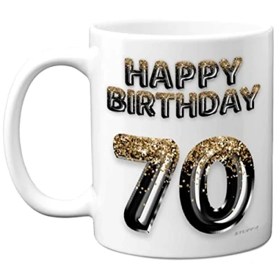 MAKE THEM SMILE ON HIS SPECIAL DAY: This exceptional quality birthday gift for her or him shows the design 'Happy Birthday 70'. If you are looking for funny birthday mugs for women, then then this happy birthday mug is bound to make them laugh. Not just for friendship gifts for women this could also be for Best Friend, Work Colleague, Mum, Grandma, Nan, Dad, Grandad, Nanny, Colleague, Brother, Sister, Cousin, Auntie or Uncle. WHAT DO YOU GET: This novelty mug for him or her is made from the highest quality mugs available on the market. An 11oz ceramic gloss finished mug with a large handle for ease of use. The cheeky design is printed on both sides so no one will miss it. Incredibly funny and thoughtful gifts for women and men from Stuff4 Ltd. PACKED FOR PROTECTION: Every order is packed in a drop proof double walled cardboard Mug Mailer which are lightweight and strong enough to provide total protection. So have the birthday boy in pieces and not the rude mugs, Dad birthday gifts, Uncle birthday gifts, Grandad birthday gifts. MADE AND QUALITY CHECKED IN THE UK: We manufacture all our product right her in the UK so you can be sure of a fast turnaround and a product that is expertly made - for his birthday gifts. 11oz DISHWASHER AND MICROWAVE SAFE MUGS: Made from premium ceramic our 11oz heavyweight mugs are manufactured with a dishwasher safe premium coating. This means that the colours of your image will not fade from even after multiple cycles (up to 800) through a dishwasher. They are also microwave safe.